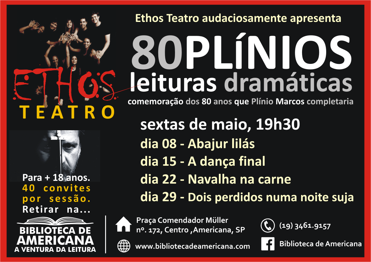 O grupo teatral Ethos, de Americana, celebra os oitenta anos do saudoso Plínio Marcos com uma série de intensas leituras dramáticas de obras premiadas do seminal dramaturgo. Além das leituras, cada noite terá extras e surpresas imperdíveis.