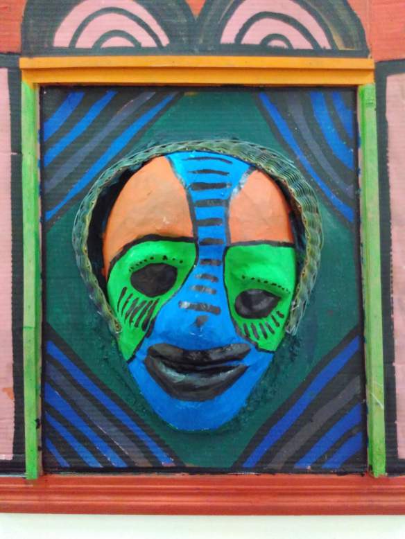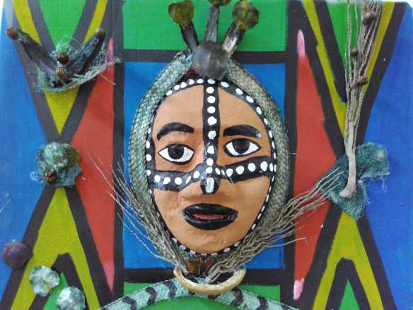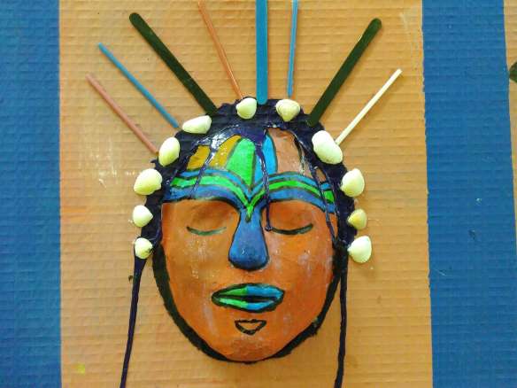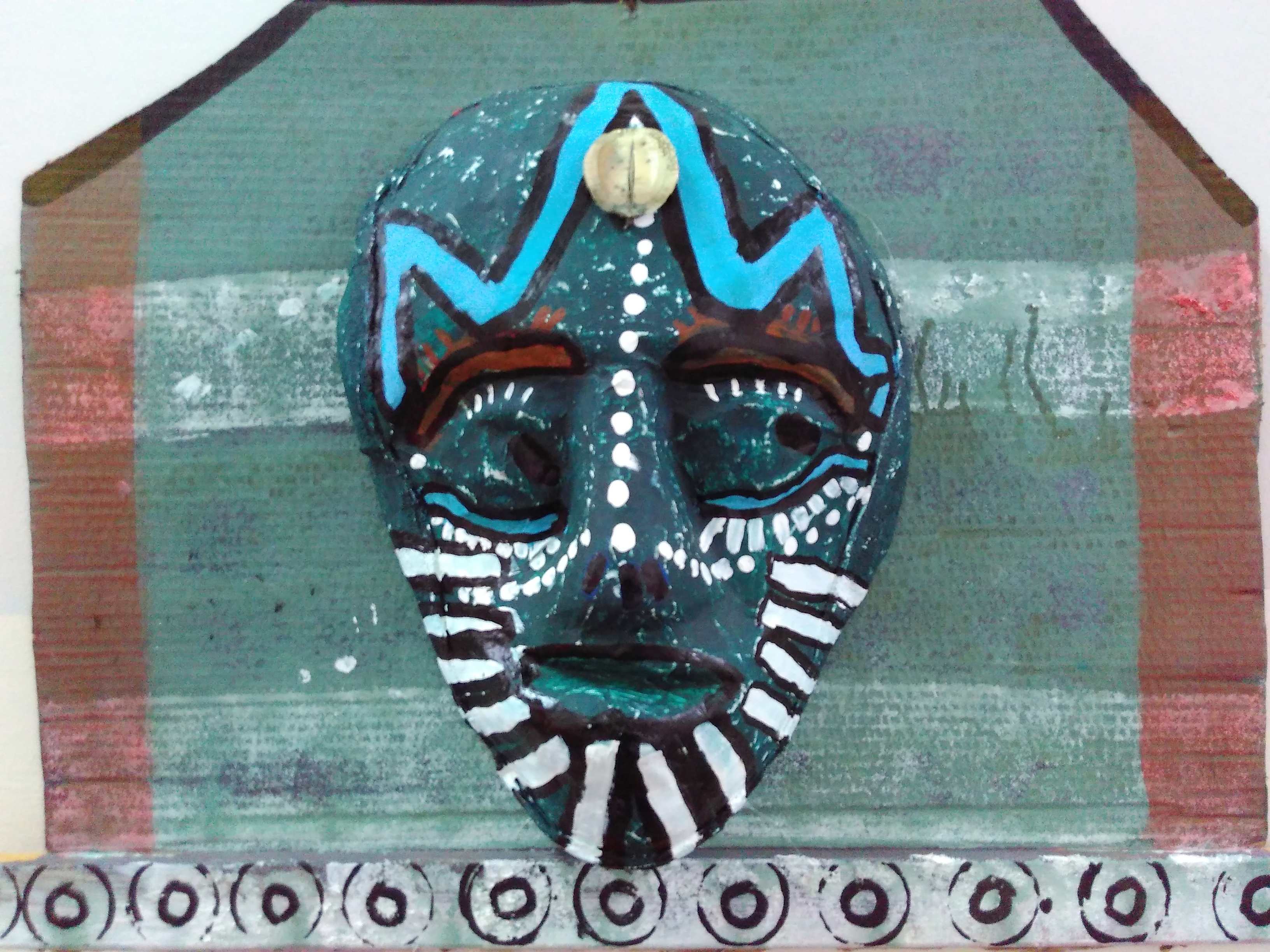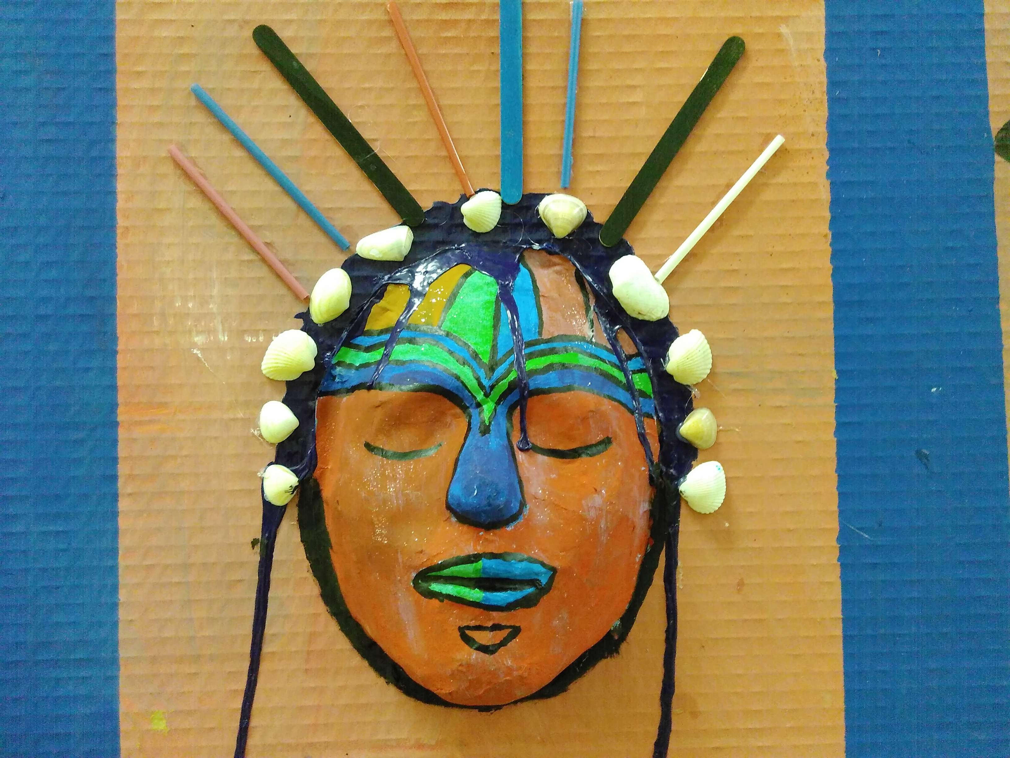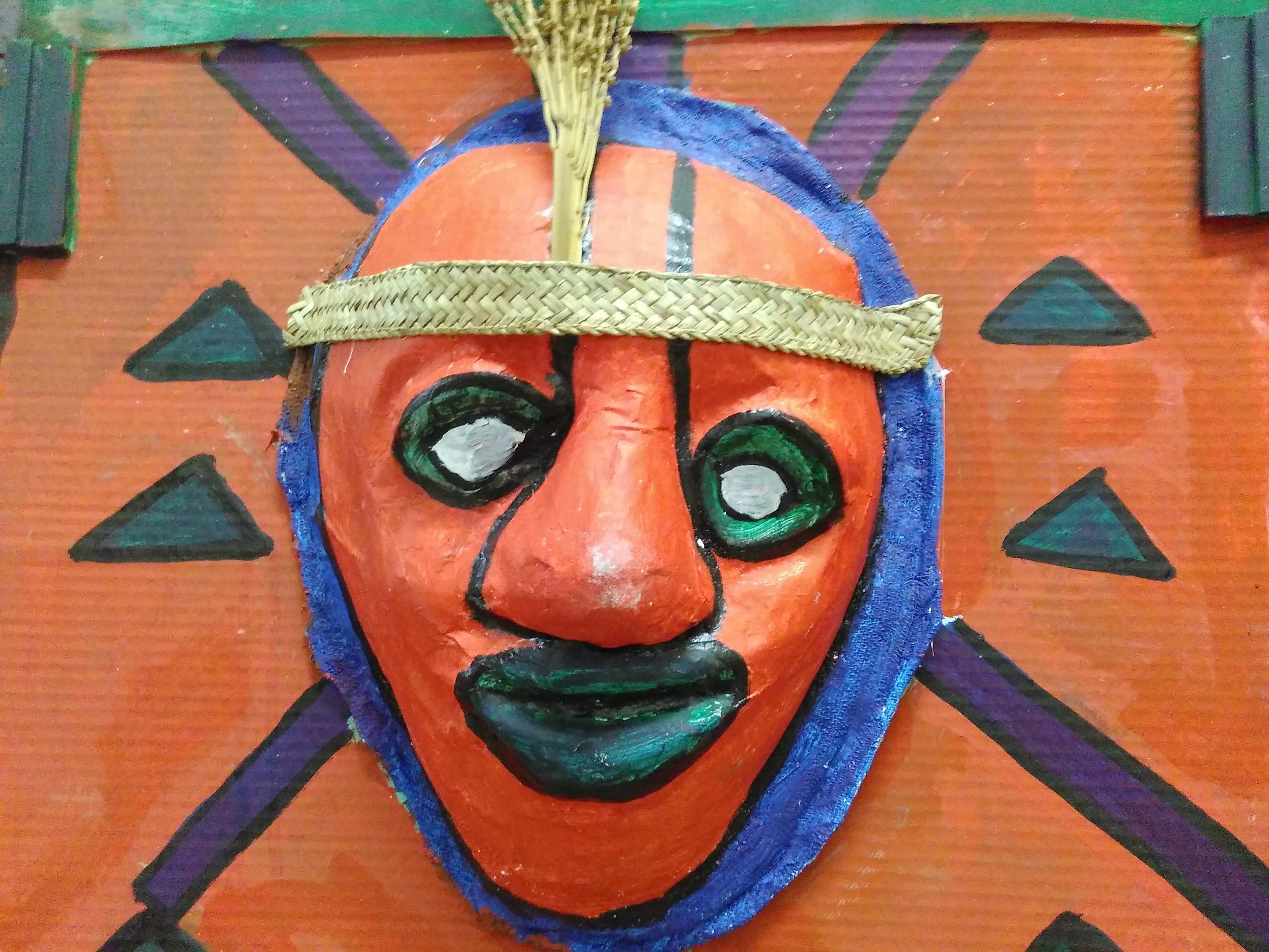 A produção-criação navegou poeticamente por áreas artísticas e visuais. Um fazer coletivo que levou a concluir: “NÓS (alunos) colamos, cortamos e pintamos o papelão (suporte), NÓS fizemos a máscara (papietagem), e sua pintura e finalizamos com a colagem,…”. Todos assinam a obra.