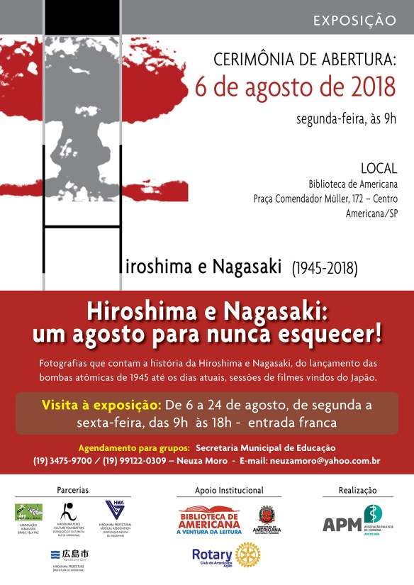 A Biblioteca de Americana tem a honra de acolher a exposição “Hiroshima e Nagasaki: Um agosto para não esquecer!”, desenvolvida pela Associação Paulista de Medicina (APM), representada em nossa cidade pela Associação Médica de Americana (AMA), e ofertada a nossa instituição pelo Rotary Club Americana-Ação.