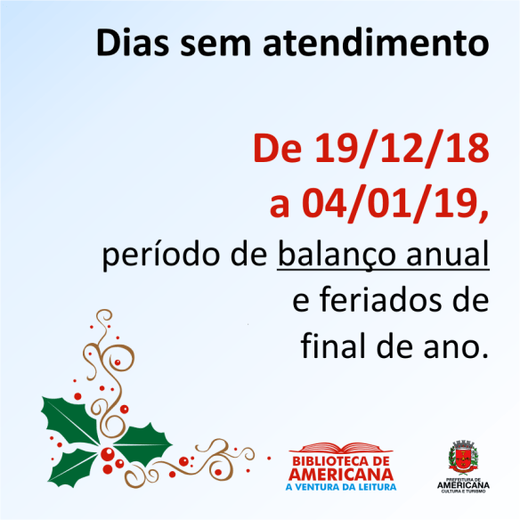 Balanço anual 2018 Publicado em 19/12/2018 por bibliotecadeamericana BALANÇO ANUAL De 19 de dezembro a 04 de janeiro A Biblioteca deixa de atender o público durante este período para realizar conferências e manutenções. O atendimento retorna segunda, dia 07/01/19. Compartilhe: Clique para compartilhar no X(abre em nova janela) 18+ Clique para compartilhar no Facebook(abre em nova janela) Facebook Clique para enviar um link por e-mail para um amigo(abre em nova janela) E-mail Clique para imprimir(abre em nova janela) Imprimir Curtir Carregando... Relacionado