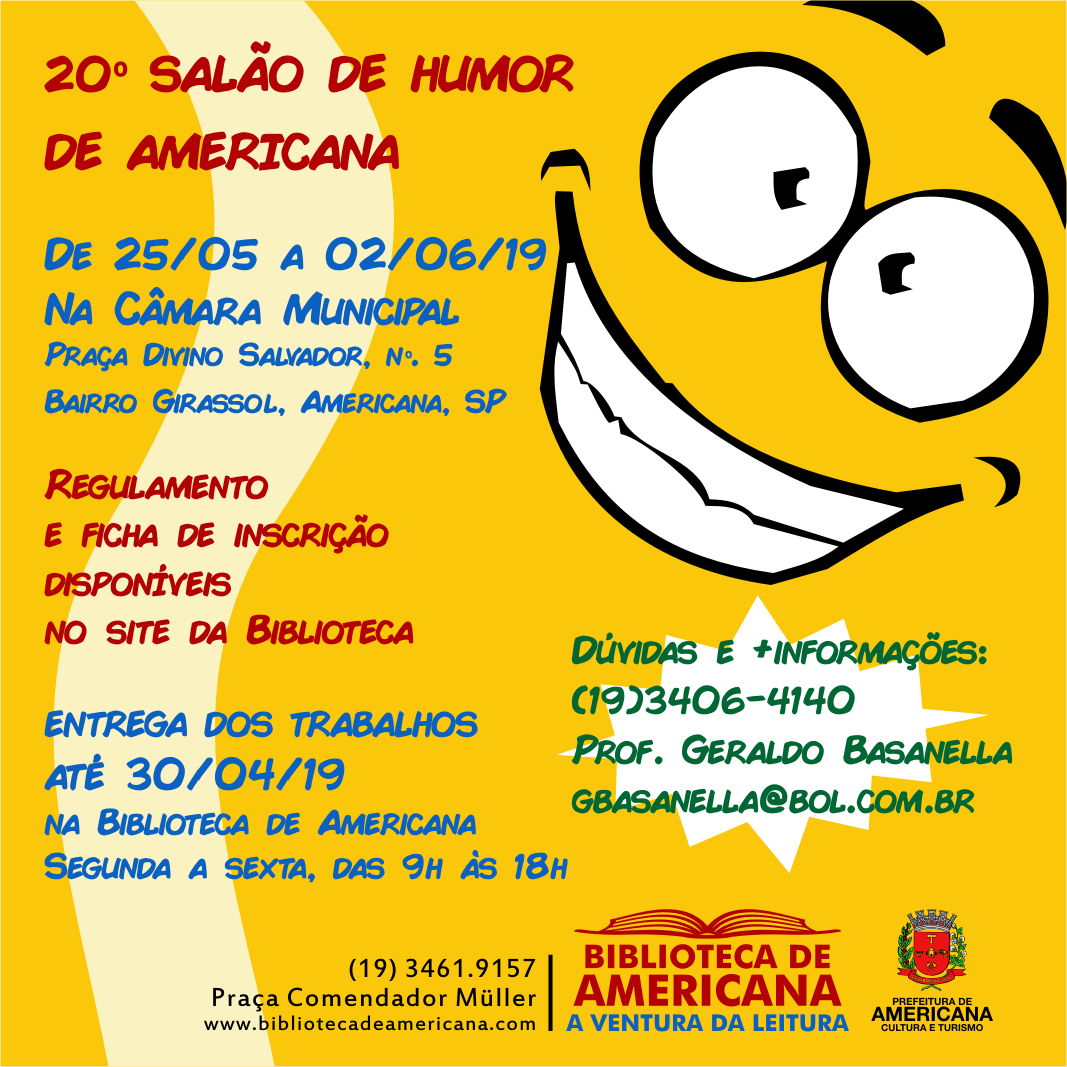 Entregar os trabalhos em envelope identificado com o nome do participante e o Título “Salão de Humor de Americana 2019”. Incluir ficha de inscrição preenchida. Mais detalhes do regulamento.