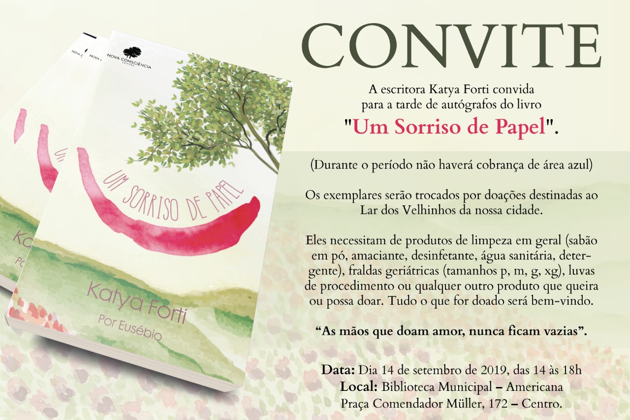 Exemplares serão autografados e as doações recebidas, no sábado, dia 14 de Setembro de 2019. Entre 14h e 18h. Na Biblioteca Municipal de Americana. * Durante o período não haverá cobrança de área azul.