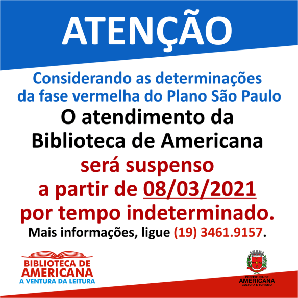 Considerando a alteração de fase de todo o Estado de São Paulo decretada pelo Governo Estadual e seguindo as determinações do Plano São Paulo, a Biblioteca de Americana informa que suspendeu o atendimento em 08/03/2021, até nova reclassificação permitir o retorno das atividades.